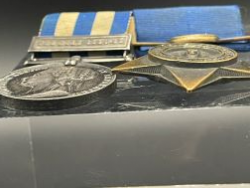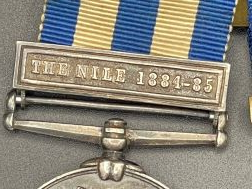 Egypt Pair ( Nile 1884 - 85 - Clasp ) & Kheddives Star - 1st Gordon Highlanders - Issued to 1082 Pte J Mcinally Really nice pair - mounted on small bar to wear. I would say ribbons are original but have been shortened to fit bar, to wear. Patina on the medals are great original condition.