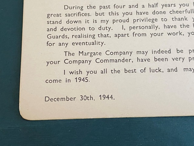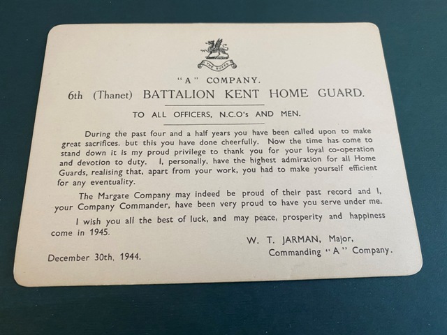Home Guard  - 6th Thanet Battalion Kent Home Guard - December 1944.  A Company - To All Officers NCO's and Men - By W T Jarman ( Major Commanding " A"  Company )