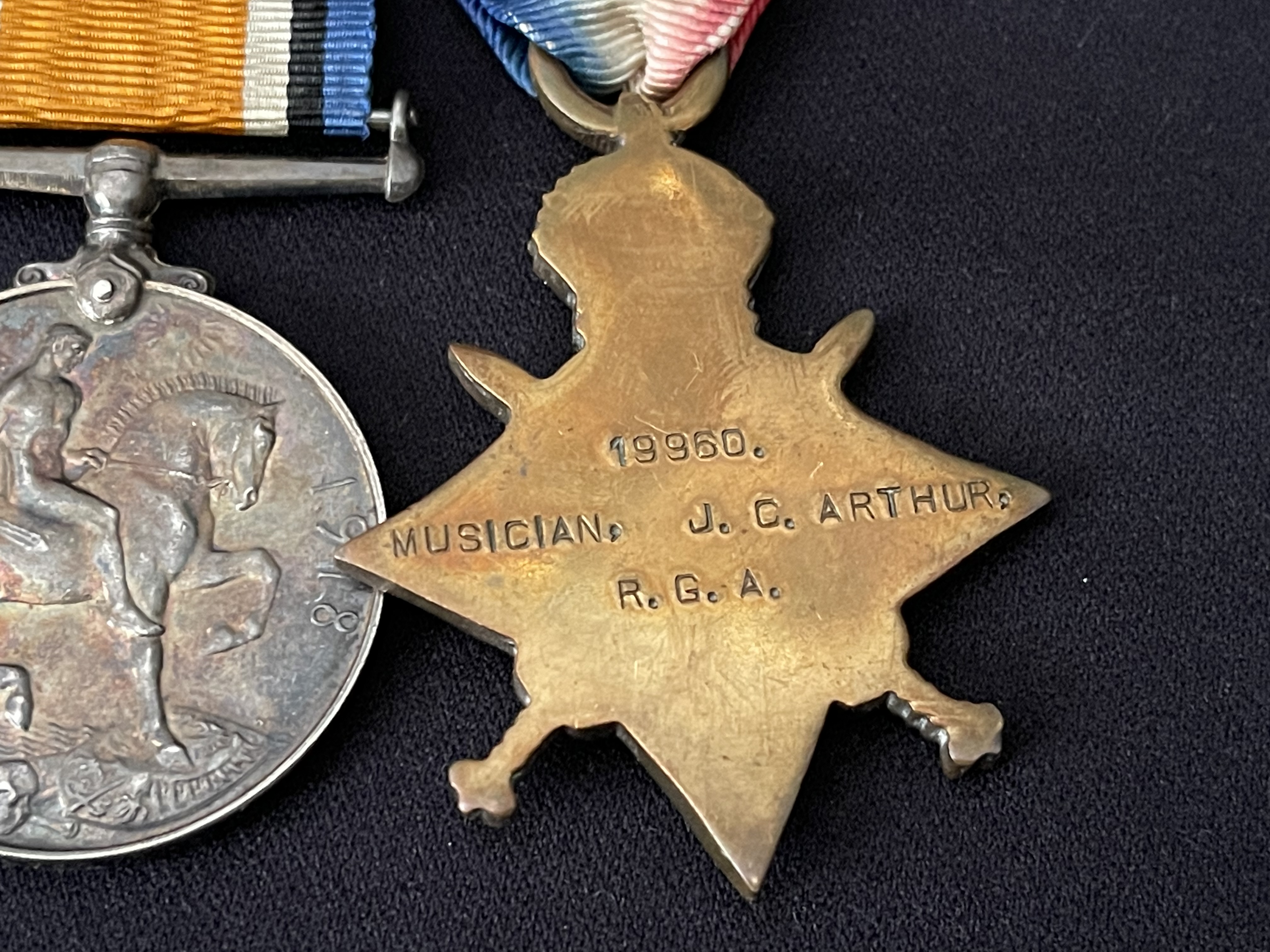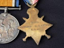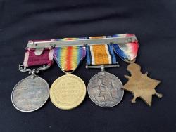 Musician 19960 James/Jas cant Arthur Royal Garrison Artillery - Royal Artillery - Served in the Royal Artillery Band at Woolwich - Arsenal - 1915 Star BWM - VM & Long Service Good Conduct - George V Head. Medals are mounted on a swing bar. Original Ribbons. DOB: 1883 Came from Irvine - Ayrshire. Attested: Boy 10th May 1897 - Appointed Bandsman in 1901 Woolwich. Married to: Annie Louise Puddefoot of Islington London. Served in france from the 21st December 1915 To 25th April 1916. All medals are confirmed.