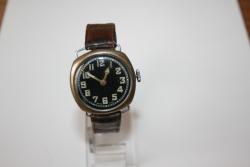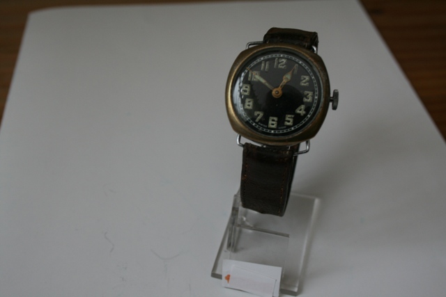 Officers WW1 Trench Watch Looks to be original strap. Black Face economy issue, as the great war went on metal became scarce as was used more for the making of weapons and ammunitions. This watch has the wood version face - All original still working. As for accurate timing I haven't tested it. Mechanical wind, metal case some marks and wear on case as expected for the year, glass seems to be free of scratches. Strap in good condition. SOLD