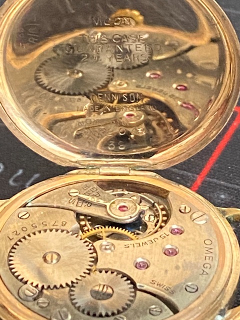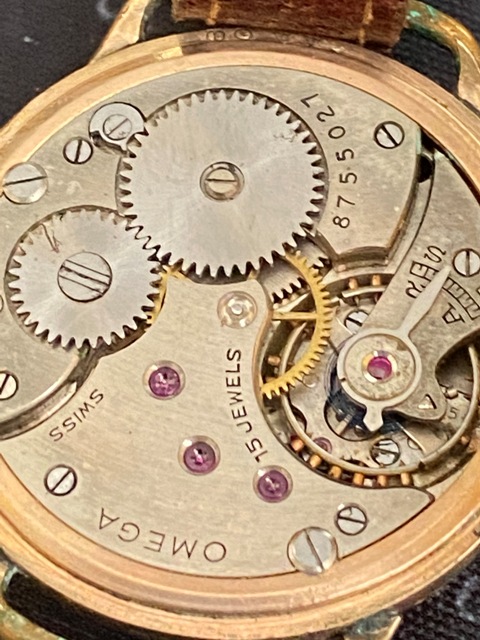 Omega Vintage Watch circa 1930's - Mechanical Wind - Probably Gold Plated, or Rose Gold - As I can see no hallmarks - However is numbers inside case - - Dennison case - Serial Number - 8755027 - 15 jewels. Really lovely wristwatch - I would say Officers or gentleman's watch of period - Strap I would say to period. Nicely ticks away as it should. Original Omega.