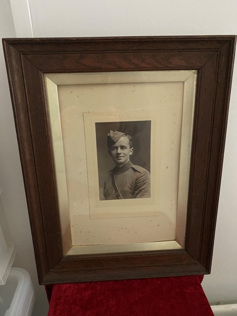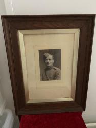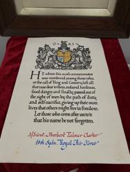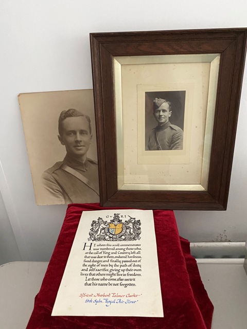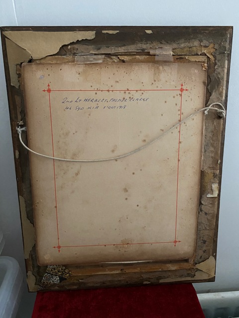 2nd Lieut Herbert Palmer Clarke - 46th Squadron R A F - From The Hollies, St James' Crescent, Clackton on Sea. D O B - 23rd August 1892 - Died 1st October 1918 - Age 27. Son Of James Carr Herbert and Mary Ann Clarke; husband of Dorothy Clarke, of Southwood Old Road., Frinton- on-Sea. Picture's Only -( Sadly medals are missing ) Frame Height is 16" inches Width is 12" inches With Glass holding the picture in, little tacky on reverse. Frame looks to be to period. Also there is another Large Original Photgraph Of 2nd Lieut Herbert Palmer Clarke. Measures 12" inches by 10" He is remembered with honour at Bronfay Farm Military Cemetary, Bray-Sur-Somme. Included in this set is his death scroll which has been mounted on cardboard, & 2 photos of Herbert. The death scroll records him as 2nd Lieutenant Herbert Palmer Clarke, 46th Squadron Royal Air Force, however of course prior to 1st April 1918 it was called the Royal Flying Corps. Herbert was flying a Sopwith F.1 Camel when he was killed in France. (Wikipedia - The Royal Flying Corps (RFC) was the air arm of the British Army before and during the First World War, until it merged with the Royal Naval Air Service on 1 April 1918 to form the Royal Air Force.) SOLD SOLD SOLD