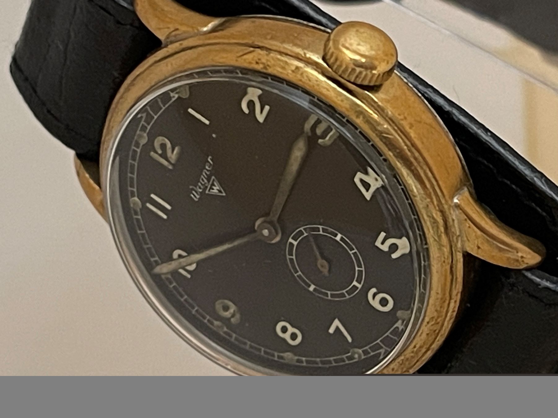 WW2 - Wagner - German Air Force Watch - Pilots military wristwatch - Movement ; Urofa 58 - Mechanical wind - Circa; dates: 1943 -44. Good working order fully serviced has had a replacement strap, keeping in theme with original strap. Band 18mm.35.5mm (Not Counting Crown )42mm Long (Lug to Lug ) 15 Jewel.